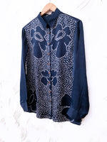 Blue front button down placket shirt with hand done bandhani in a floral pattern. The design also features subtle hand embroidery