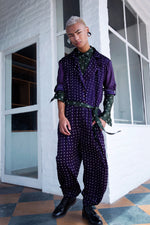 This unisex purple jumpsuit has been crafted with hand-done single dot bandhani in 100% silk. It features a front overlap placket and green silk hand-done single dot bandhani belt. The back has been accentuated with hand-done bandhani border detail.