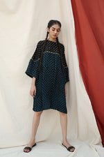 Featuring an antifit teal and black hand done bandhani dress with back placket. The design features a yellow accent piping.