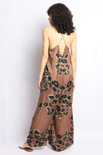 This shibori jumpsuit has been crafted with hand-done shibori silk. It features flared with and has been accentuated with hand-done bead embrodiery.