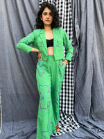 Featuring this vibrant green and purple hand done bandhani floral coord. The pants have a side zipper closure