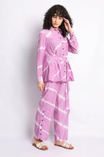 Featuring this soothing lilac shibori stripes top with front placket. The coord comes with pants in the same pattern with a side placket.