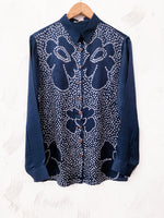 Blue front button down placket shirt with hand done bandhani in a floral pattern. The design also features subtle hand embroidery