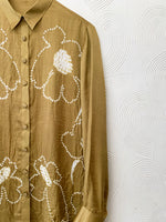 Mustard front button down placket shirt with hand done bandhani in a floral pattern. The design also features subtle hand embroidery